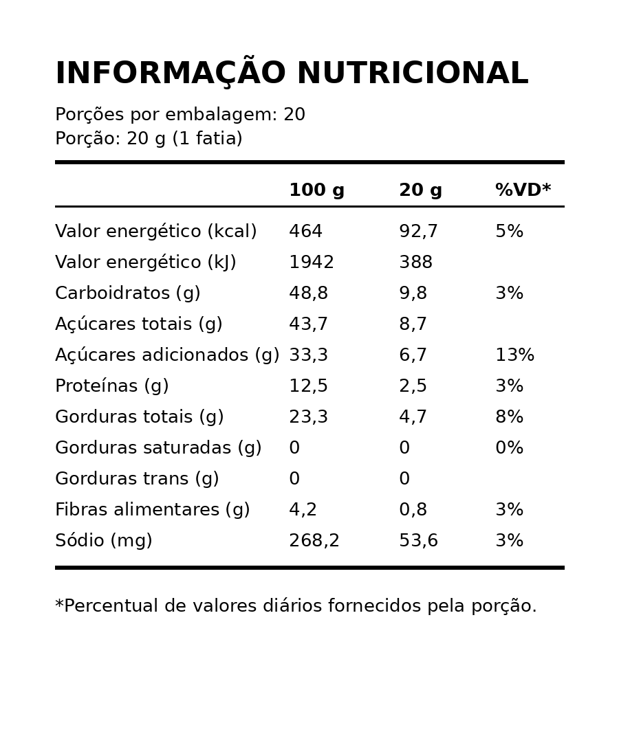Ingredientes: Amendoim torrado, açúcar cristal, xarope de glicose, sal e conservante sorbeto de potássio. Alérgicos: Contém amendoim. Não contem glúten.